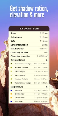 Drivers: This app lets you track the sun path throughout the day. Drivers can find the perfect parking spot by checking sunlight exposure & golden hour conditions. Track sun phases to adjust parking based on sun position for optimal lighting.